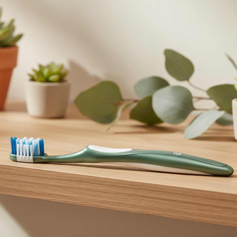 Controlled power for everyday use: Medium bristles angled at multiple angles to remove plaque, side wings to smooth enamel, and an integrated tongue scraper. Ergonomic, non-slip handle for a stable grip.
