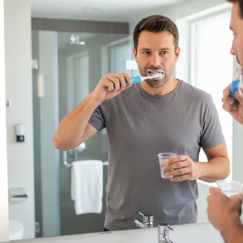 The portable brush that stays clean everywhere: soft DuPont™ 612 bristles, compact handle, and ventilated case that protects the head after use. Lightweight and ergonomic.