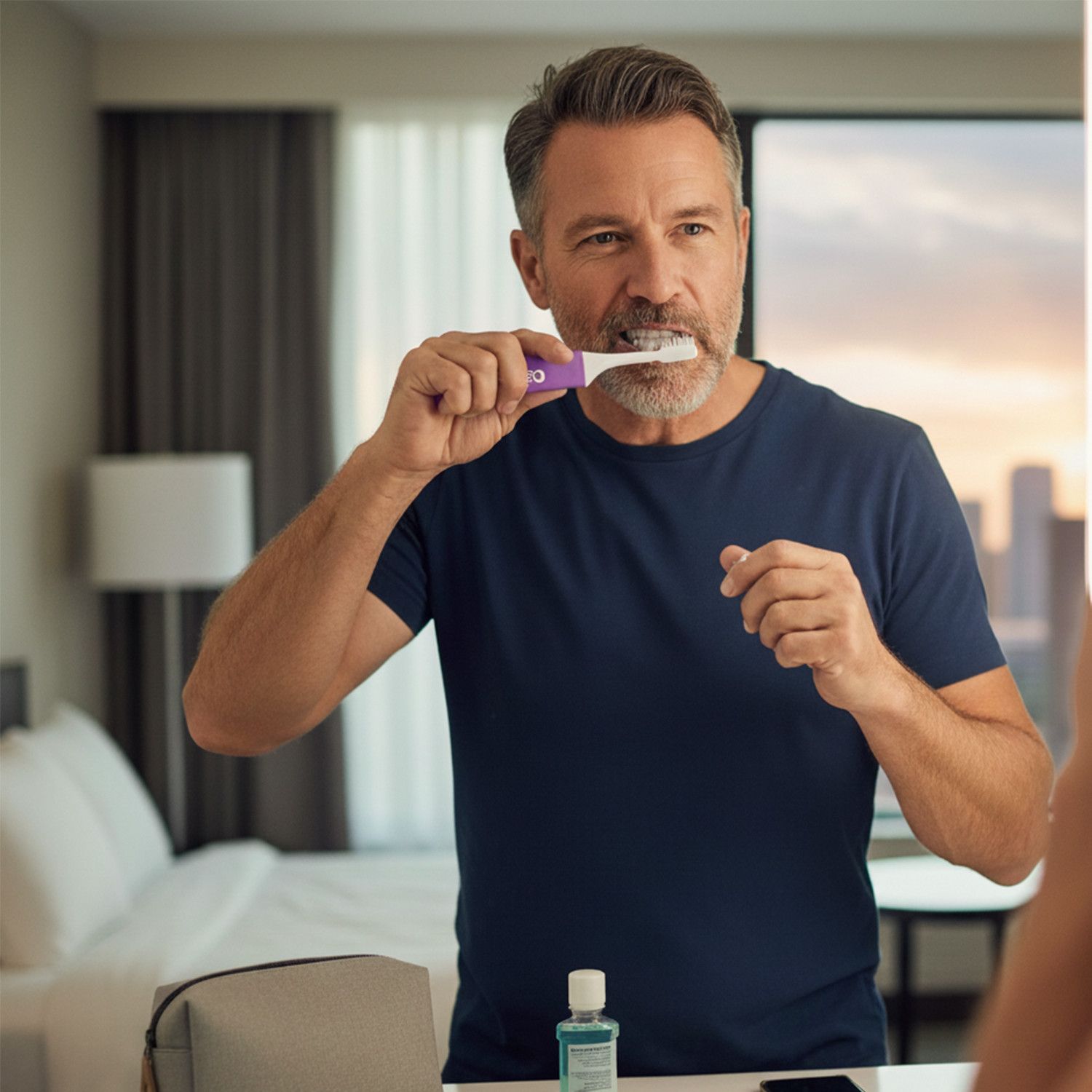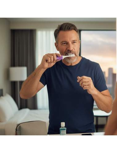 The portable brush that stays clean everywhere: soft DuPont™ 612 bristles, compact handle, and ventilated case that protects the head after use. Lightweight and ergonomic.