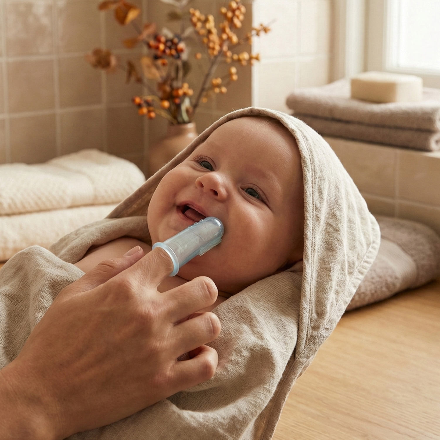 Soothe gums and care for first teeth with ease: 2 soft green silicone finger cots with a dual brush/massage texture, perfect for applying gel and for daily hygiene. Storage case included.