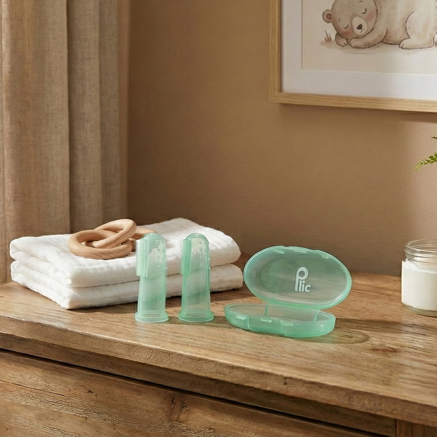Designed for early oral care, this silicone finger cot soothes sensitive gums and helps keep baby's mouth clean. Its textured surface gently massages the gums and gently removes residue from first teeth . Conveniently, it also allows for precise application of teething gel . The pack of two ensures hygienic rotation, while the case protects the finger cots at home and on the go.