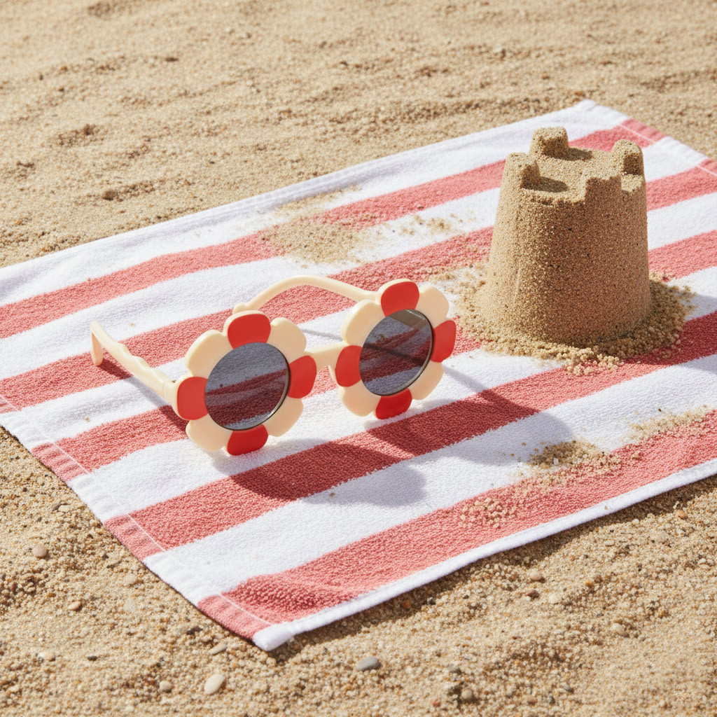 These CAT 3 flower-shaped sunglasses are designed for children aged 2 to 4. They offer 100% UV protection thanks to their category 3 TAC tinted lenses. Their flexible TPEE frame ensures comfort and a secure fit. They are suitable for outdoor activities in bright sunlight.