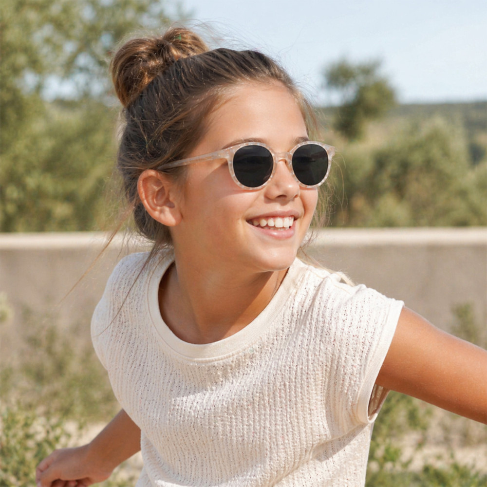 These round, mother-of-pearl category 4 sunglasses for children are designed for kids aged 8 to 12 who want both maximum sun protection and a modern style. They effectively protect eyes from UV rays while ensuring comfort and lightness for everyday wear.