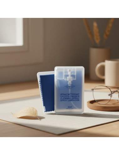 Suitable for all types of glasses. Anti-fog and antistatic formula. This spray is also recommended for cleaning surfaces such as screens: phone, computer, digital camera... This cleaning kit consists of the cleaning spray and a microfiber wipe stored on his back.