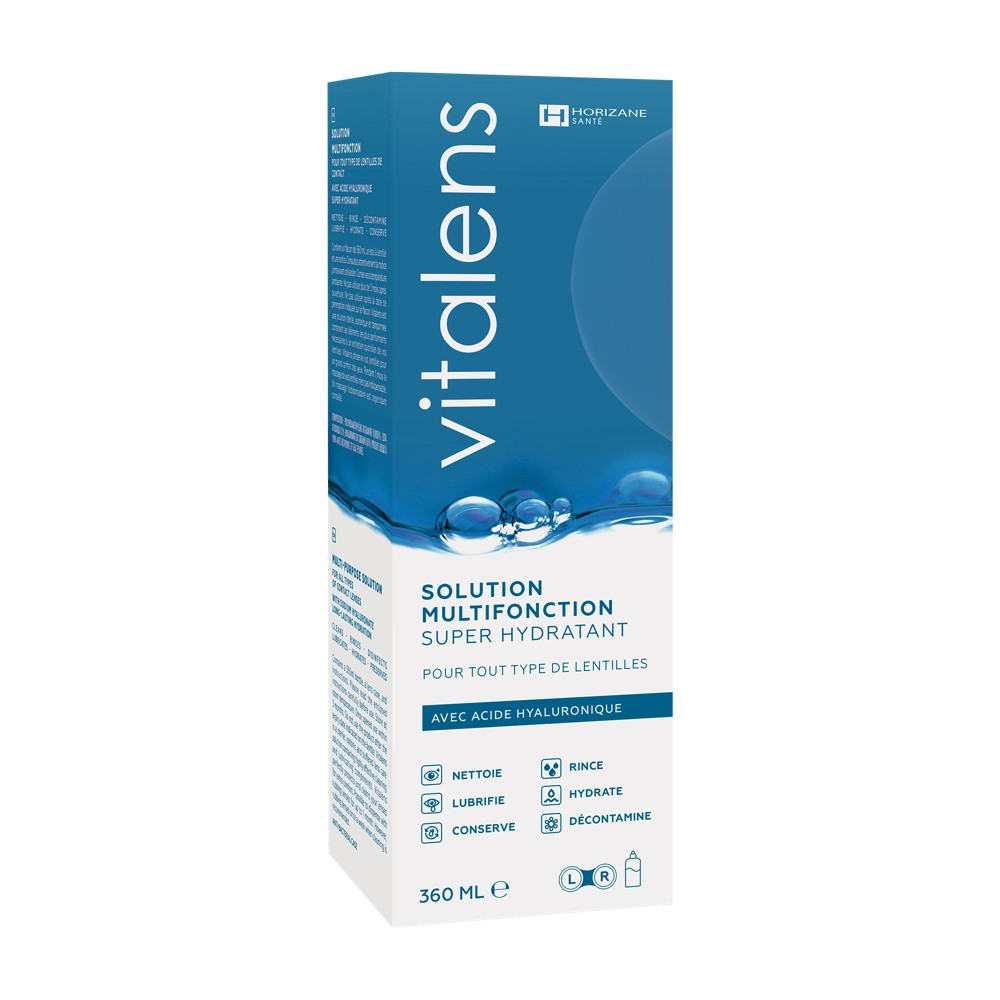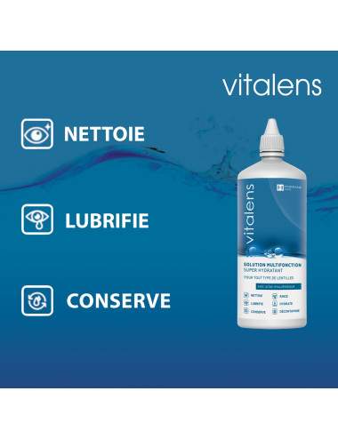 VITALENS is the perfect multifunctional solution to clean and maintain your soft contact lenses every day. It cleans, rinses, decontaminates, lubricates and moisturizes your lenses. This sterile and isotonic solution is composed of the most efficient elements such as hyaluronic acid to allow the most sensitive eyes to tolerate it very well. The composition of this lens cleanser is close to that of tears, so adapts to all types of eyes.
