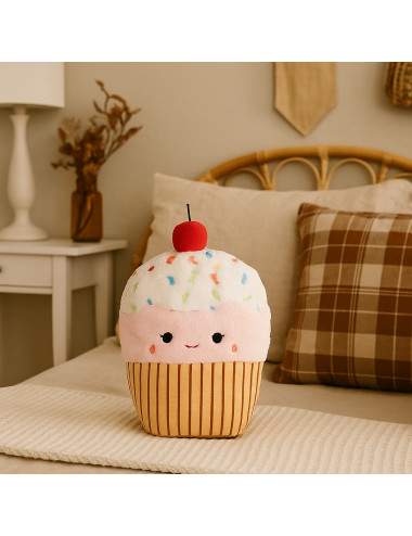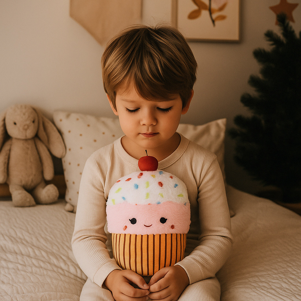 Discover the cutest treat ever, a heated cupcake-shaped plush toy that promises cuddles that are as sweet as they are comforting! With its colorful sprinkled frosting, a little cherry on top, and a mischievous smile, this cuddly toy is irresistible. But its real secret is hidden inside: a removable cushion filled with silicone beads that, once heated, diffuses a soothing warmth.