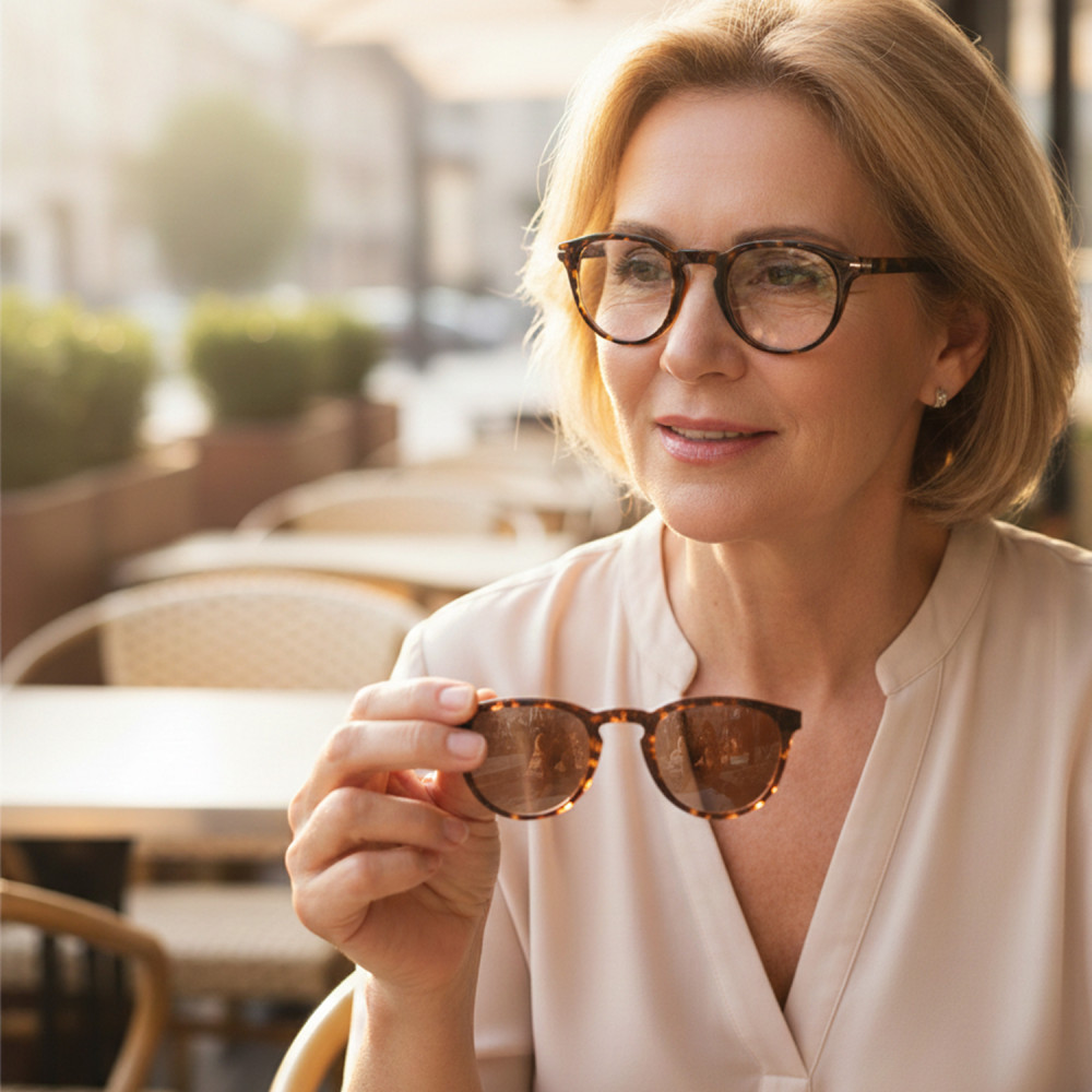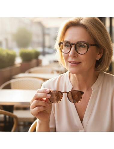 The Eclipse Tortoiseshell model combines the timeless aesthetic of the tortoiseshell pattern with a functional design for everyday use. Thanks to its removable sun clip, it allows you to read both indoors and outdoors, without needing multiple pairs of glasses.