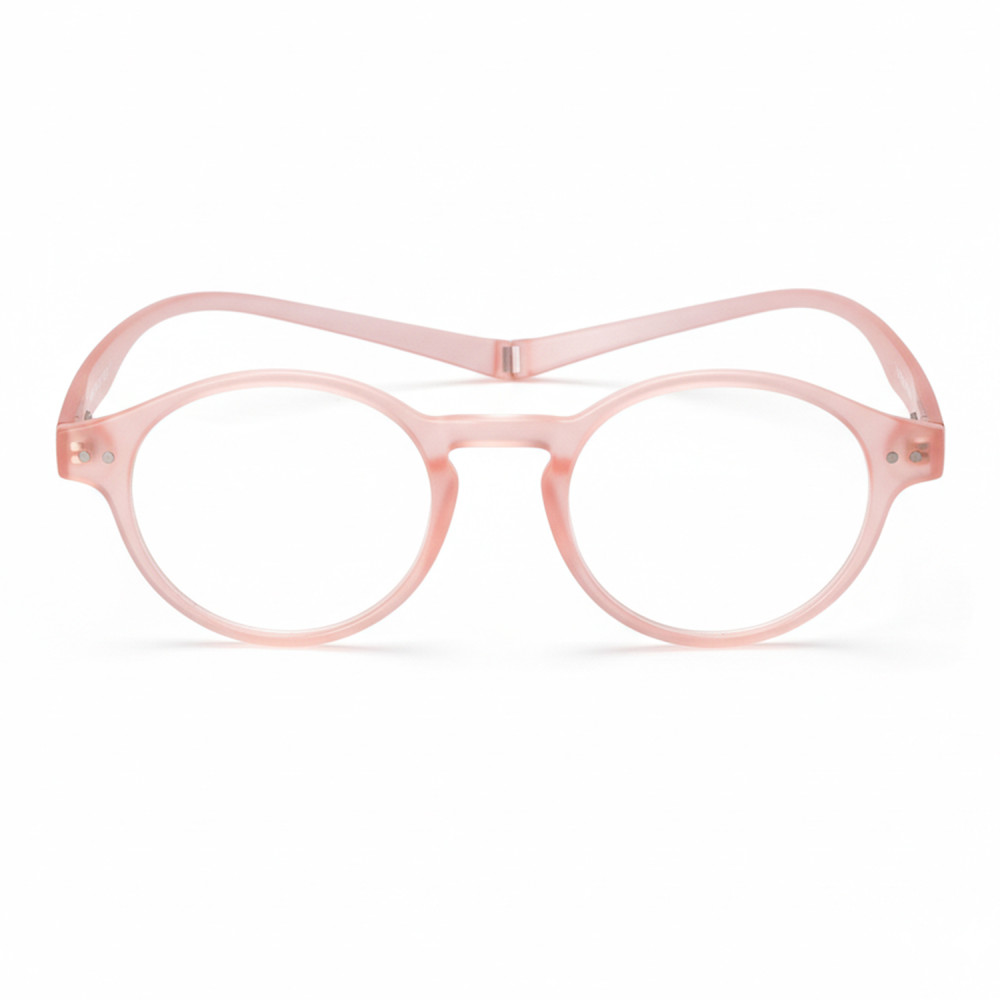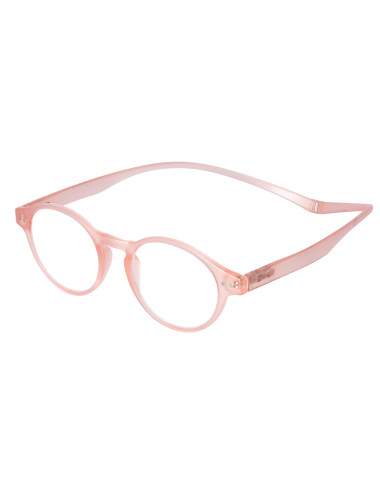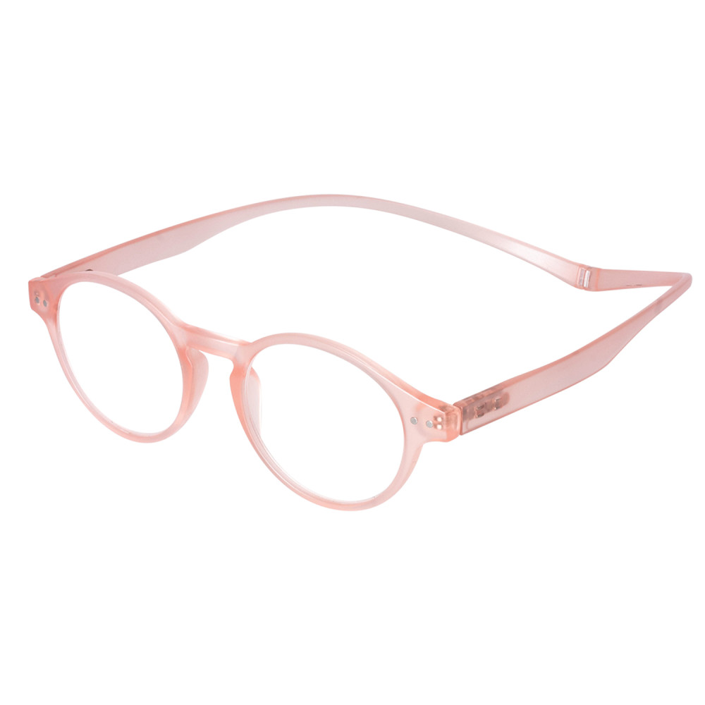 FIDELIA reading glasses fromHORIZANE are available in different shapes and colors. This round model is available in 2 colors: pastel pink and coral scale. FIDELIA is also available in rectangle format in 2 colors: two-tone black/red and blue/beige. The branches form a single strip along the neck and can easily be opened thanks to a magnet. Available in 6 diopters, from +1.00 to +3.50.