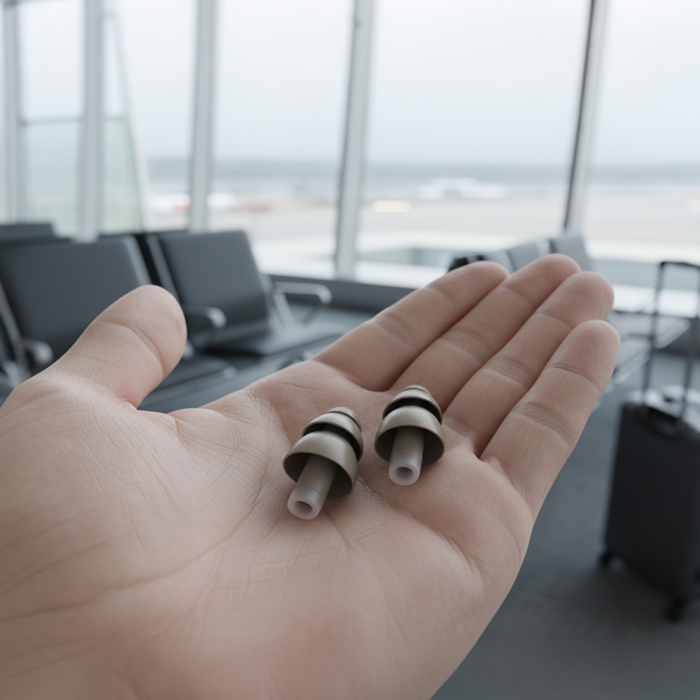 Composition: Thermoplastic elastomer cap (TPE). Our filter-free airplane earplug are composed of silicone-free and latex-free.