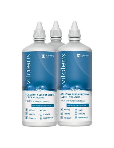 This multifunctional solution cleans, rinses, decontaminates, lubricates and moisturizes your lenses. This sterile, isotonic and buffered solution contains the most efficient elements, such as hyaluronic acid which allows sensitive eyes to obtain extreme comfort. The composition of the VITALENS lens solution is similar to that of natural tears, and thus adapts to everyone.