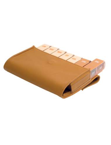 Compact and elegant weekly pill organizer: 7 days / 4 doses in a brown faux leather case. Easy-to-read markings, secure closure, and hygienic everyday transport.