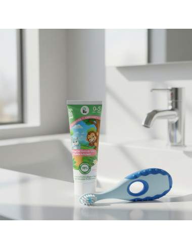 Strawberry-flavored toothpaste for children aged 0-5 is specially designed to help toddlers learn good oral hygiene. Its gentle formula, enriched with 98% naturally derived ingredients, respects baby teeth while providing effective protection against cavities.