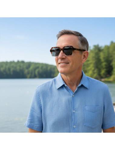 The square shape of the frame adds character to the face and suits both urban and more casual styles. The tortoiseshell finish, subtly contrasted by a translucent lower section, offers an elegant and contemporary aesthetic.