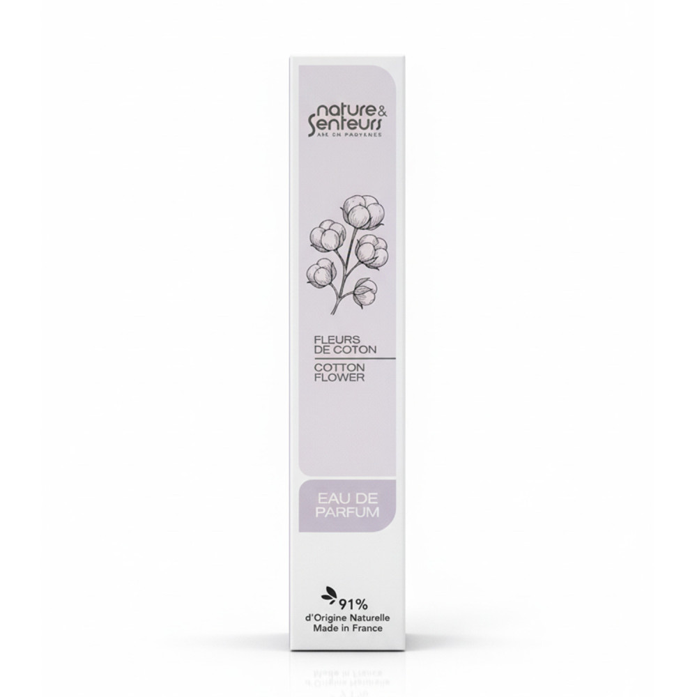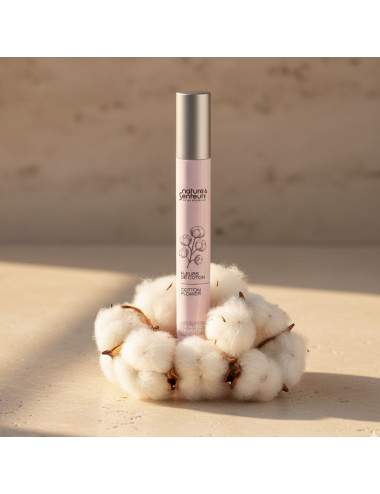 Le spray parfum nomade Fleur de Coton 15 ml diffuse une fragrance florale poudrée douce et légère, idéale pour une sensation de fraîcheur et de propreté tout au long de la journée.