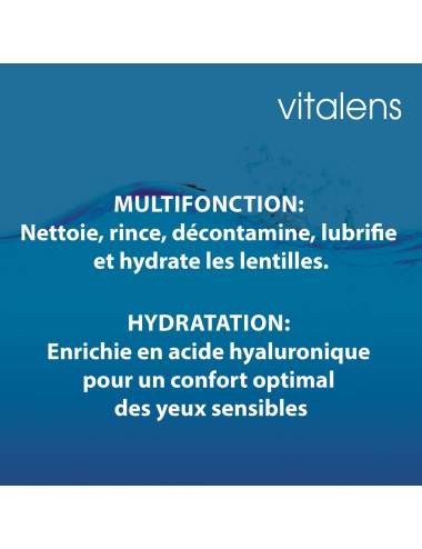 Vous souhaitez utiliser une solution une multifonction pour entretenir vos lentilles ? VITALENS est fait pour vous au quotidien. Ce produit lentilles vous garantit un confort optimal même pour les yeux les plus sensibles et favorise l'élimination des germes et bactéries.