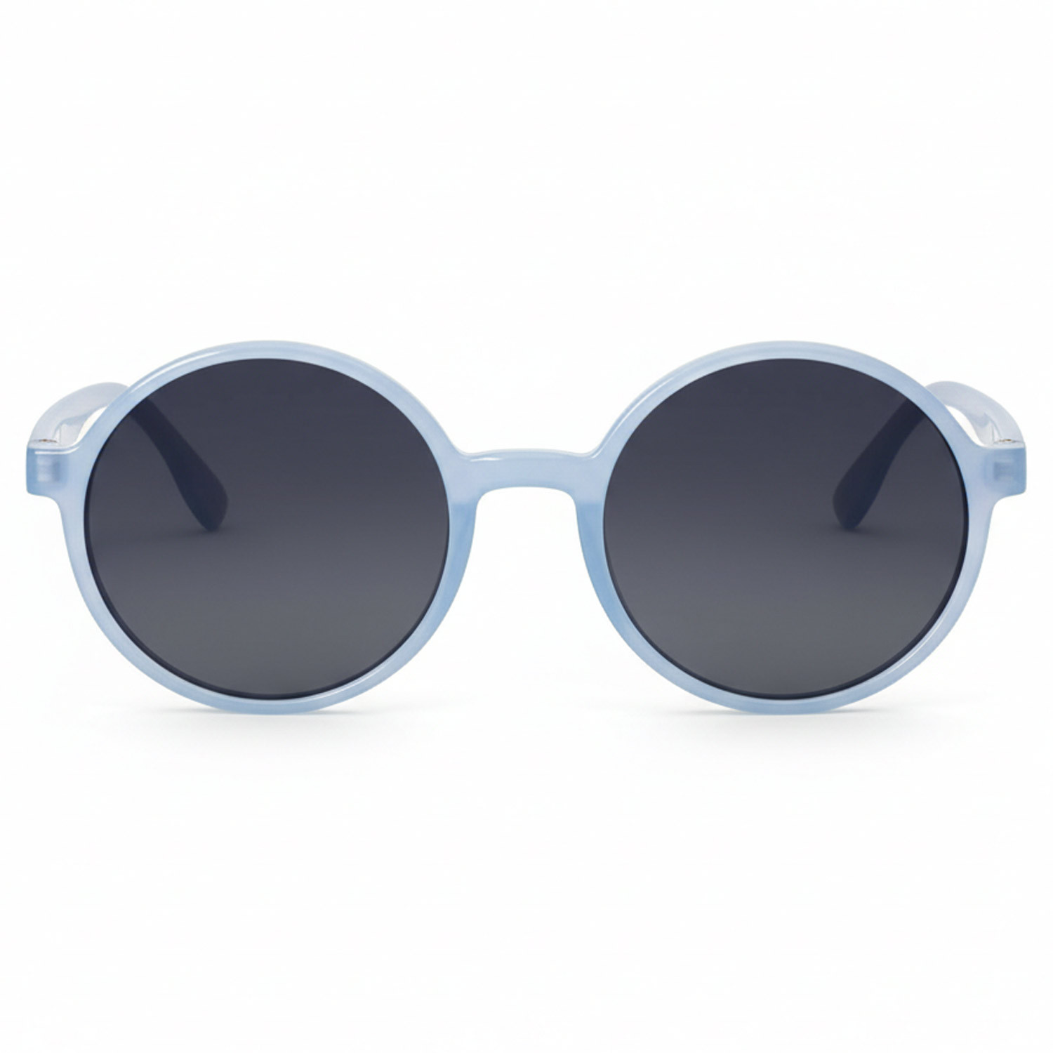 Lunettes de soleil rondes enfant 6–8 ans, catégorie 3 UV 100%, monture bleu clair translucide et verres fumés pour une protection solaire efficace et un style tendance.