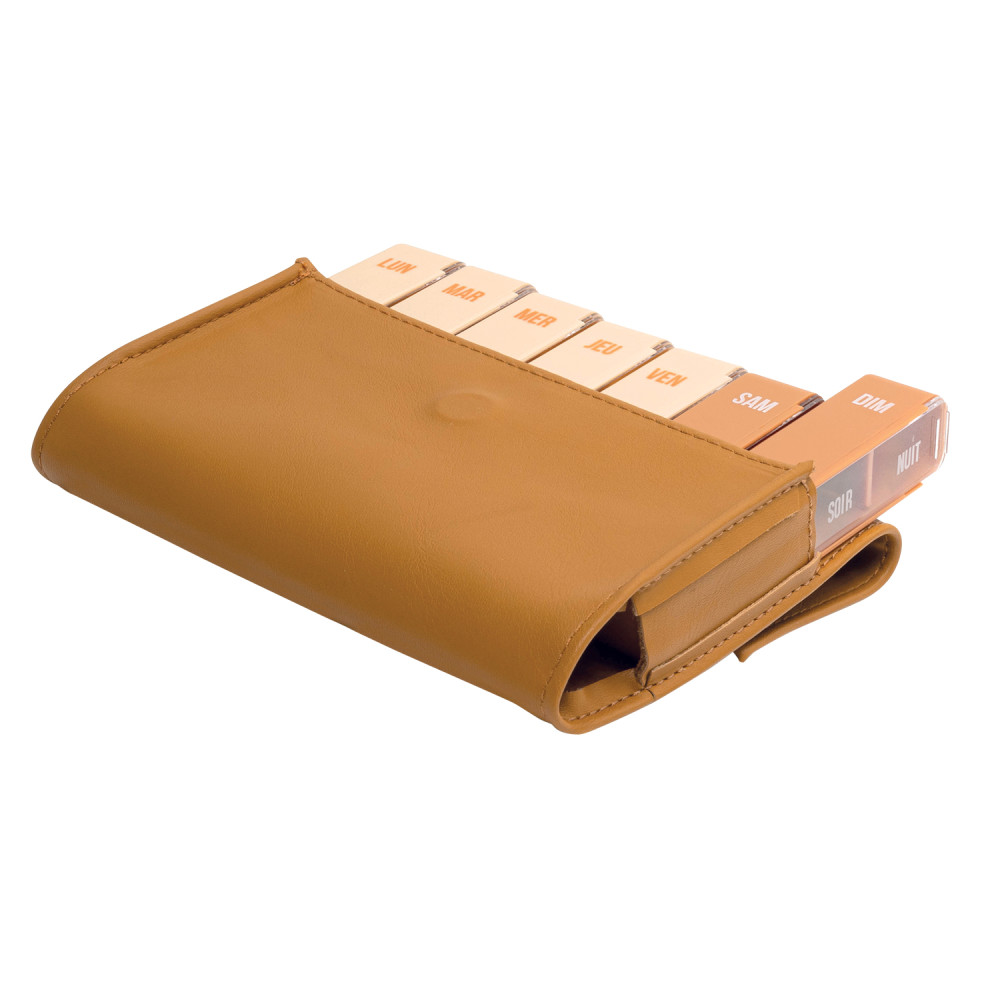 Pilulier semaine compact et élégant : 7 jours / 4 prises dans un étui simili cuir marron. Repères lisibles, fermeture fiable et transport hygiénique au quotidien.