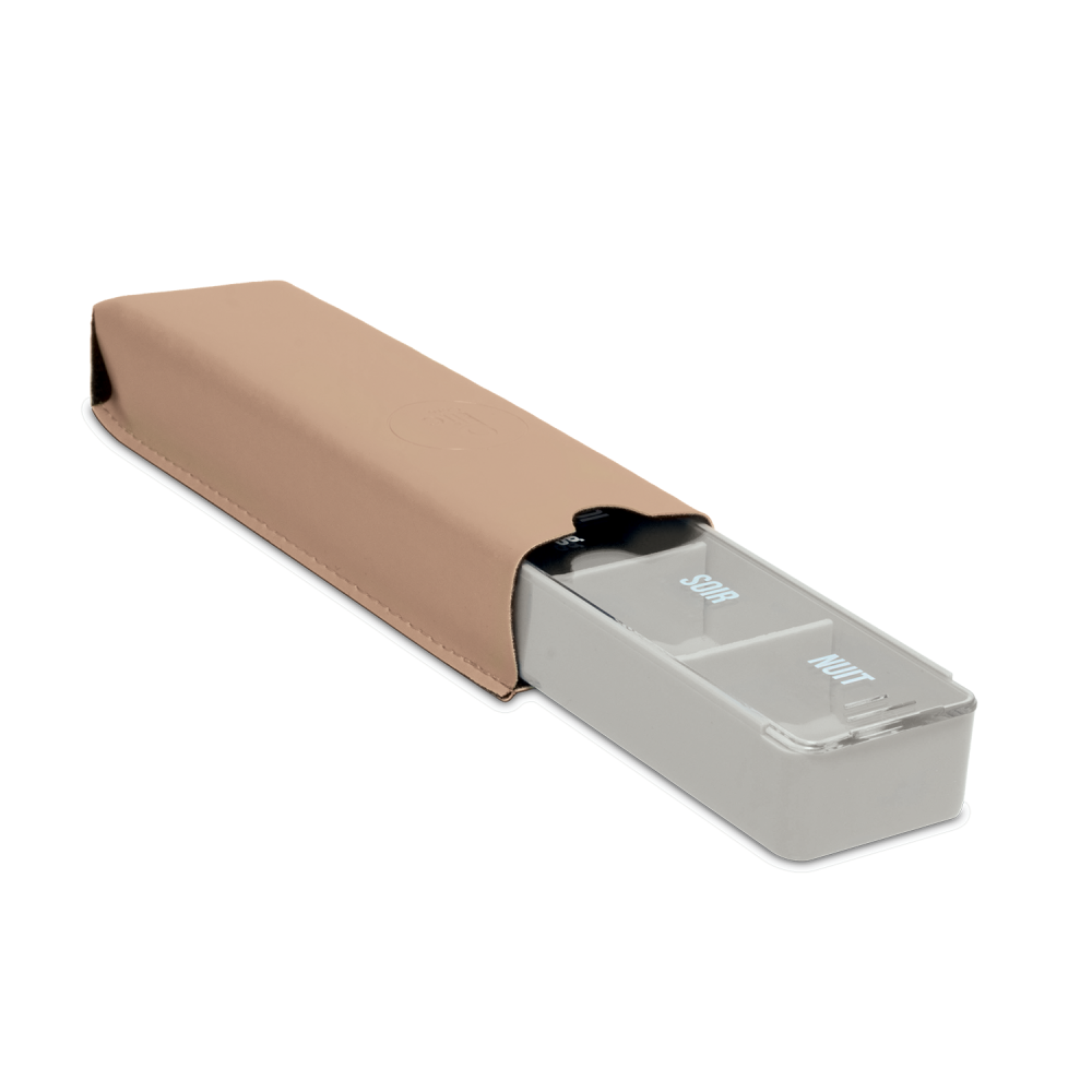 Son couvercle transparent a été imprimé au dos pour éviter que les inscriptions ne s'effacent à l'usage. Pratique et facile d’utilisation, ce pilulier peut s’ouvrir des deux côtés. Glissez le couvercle vers la droite pour prendre les comprimés du matin et du midi, et vers la gauche pour ceux du soir et de la nuit. Le couvercle contient une butée pour empêcher que celui-ci ne tombe. Des grips ont été placés de chaque côté pour éviter que les doigts ne glissent et pour faciliter l'ouverture. Une housse élégante de protection et de transport est incluse.